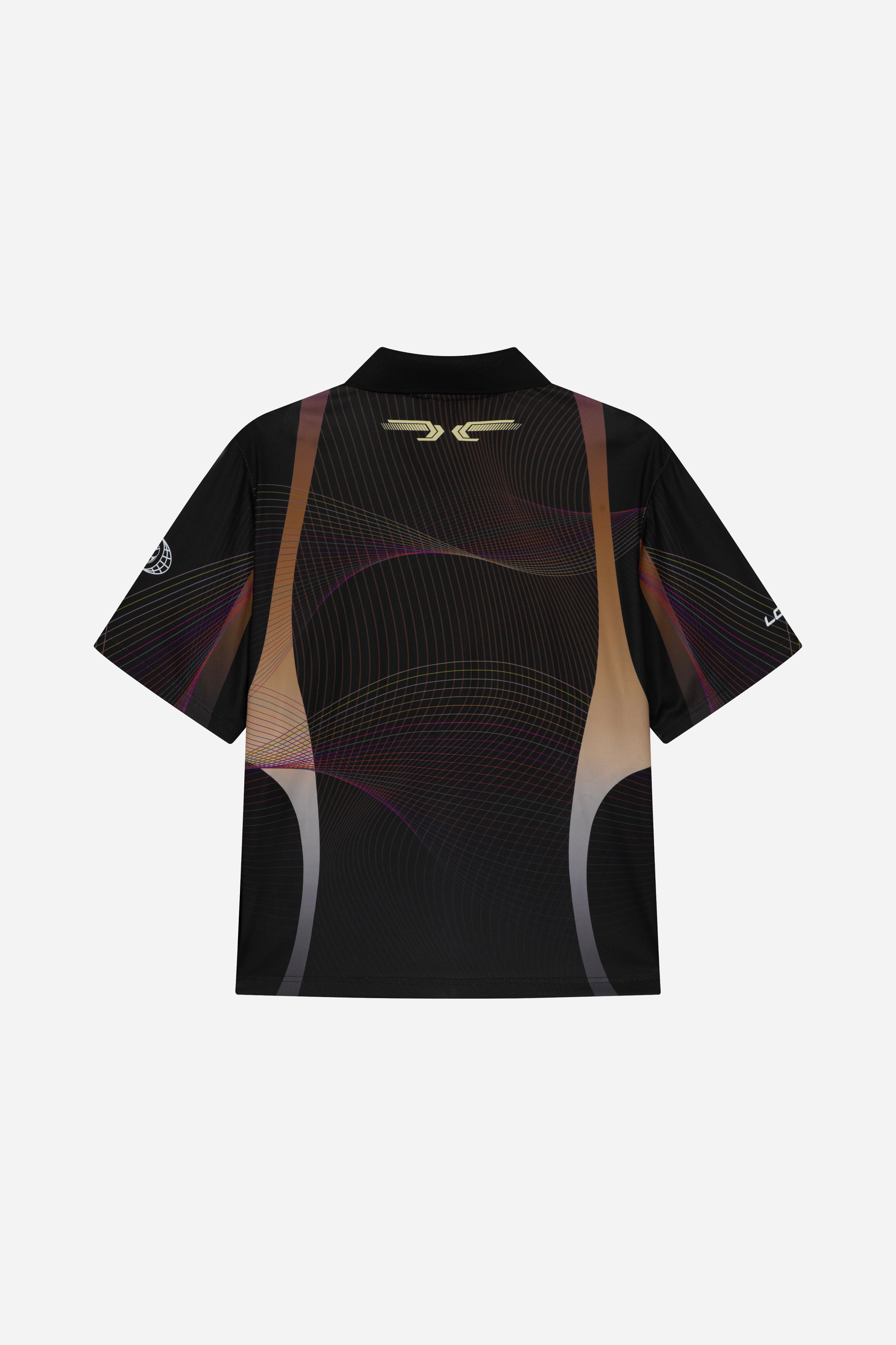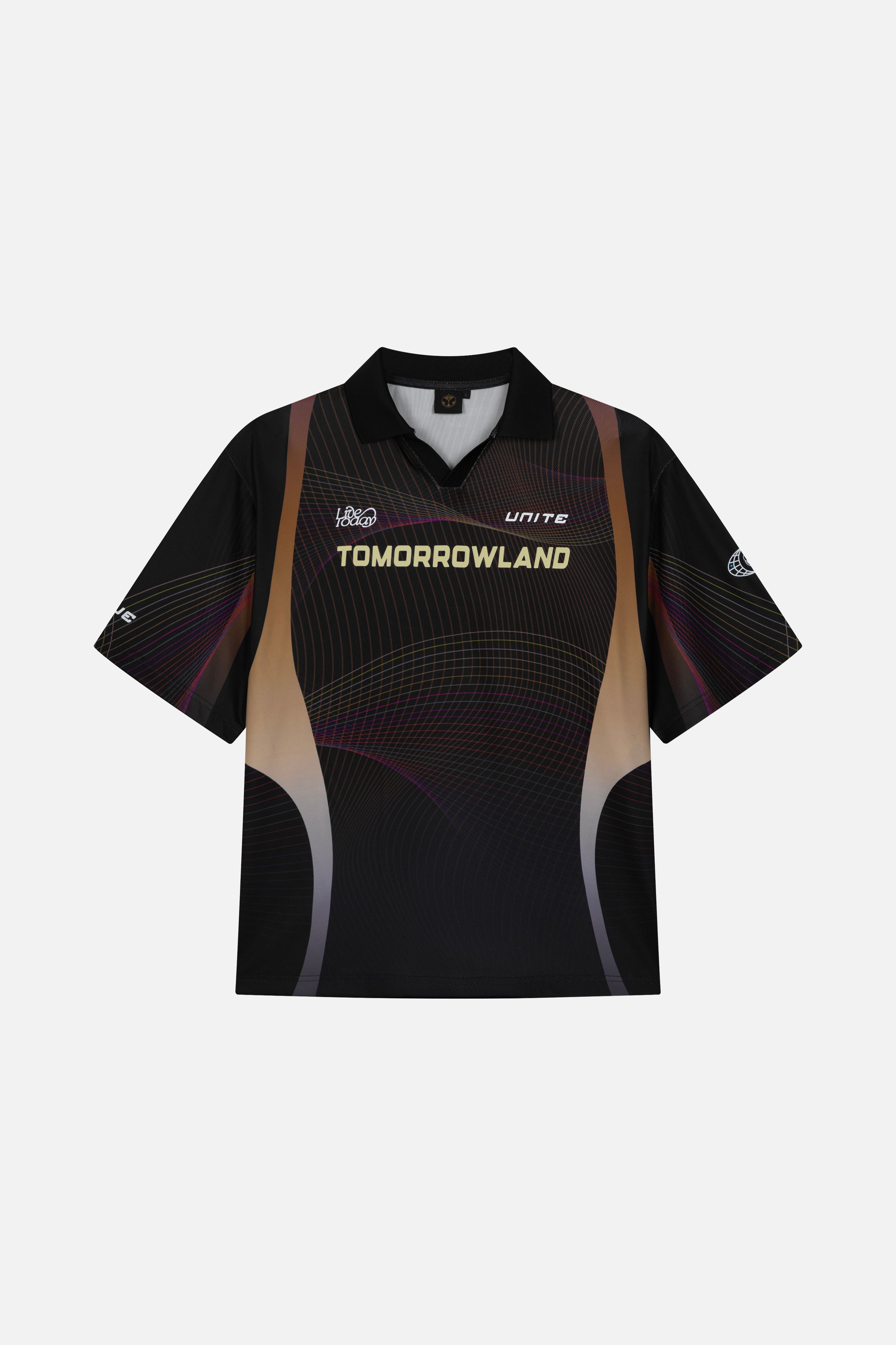 - Placed graphic allover print with Tomorrowland print in contrast at chest